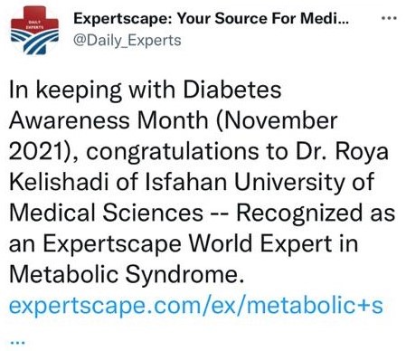 موسسه Expertscape که به موضوعات پزشکی روز دنیا و معرفی متخصصین برجسته می پردازد، به مناسبت ماه آگاه سازی دیابت (نوامبر 2021)، در توییت روزانه خود به تاریخ 16نوامبر2021، سرکار خانم دکتر رویا کلیشادی، عضو هیات علمی دانشگاه علوم پزشکی اصفهان و رییس پژوهشکده پیشگیری اولیه از بیماریهای غیرواگیر را به عنوان متخصصی برجسته در زمینه سندرم متابولیک در سطح جهانی معرفی کرد.
