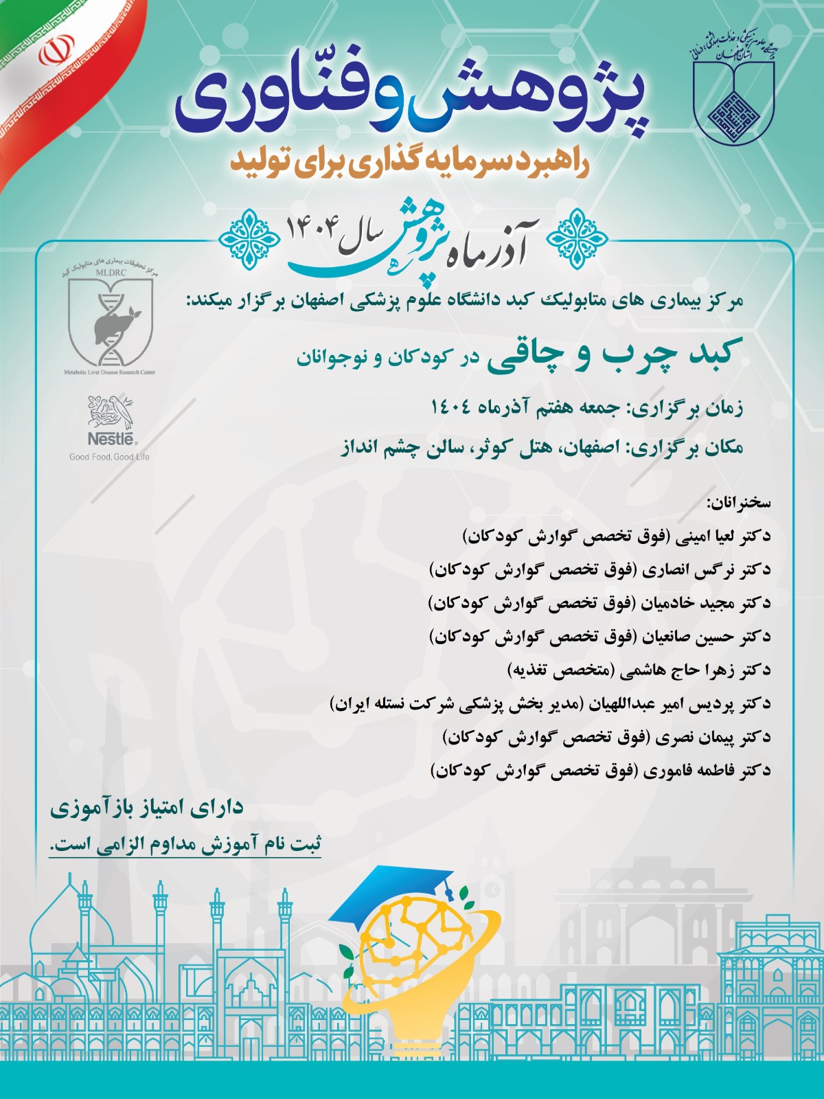 در راستای برنامه های آذرماه پژوهش، سمینار "کبد چرب و چاقی در کودکان و نوجوانان" در روز جمعه هفتم آذرماه 1404 در سالن چشم اندازه هتل کوثر توسط مرکز تحقیقات بیماری های متابولیک کبد و با حضور اساتید غدد و گوارش اطفال برگزار گردید. در این سمینار، اساتید گوارش اطفال و تغذیه مطالبی در خصوص تشخیص، درمان، پیشگیری ومراقبت های بالینی  کبد چرب و چاقی در کودکان و نوجوانان ارائه نمودند که مورد استقبال مخاطبین قرار گرفت.